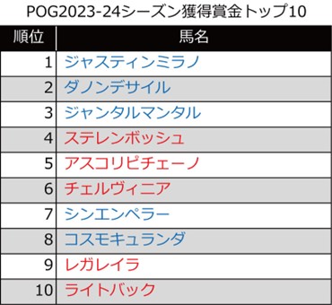 この原稿の執筆時点では2024-25シーズンはまだ終了していないので、2023-24シーズンを参考にすると、ダービー週までの本賞金ベスト10(JRAの競走のみ)は牡馬・牝馬5頭ずつ。これはレガレイラがホープフルSを勝ったことも影響しているのではと思い2022-23シーズンも調べてみると、牡馬7頭・牝馬3頭。2021-22シーズンも同じだった。牡馬・牝馬の指名バランスは7:3か6:4あたりがよいように思う。牝馬指名が得意な人は5:5でもいいだろう。